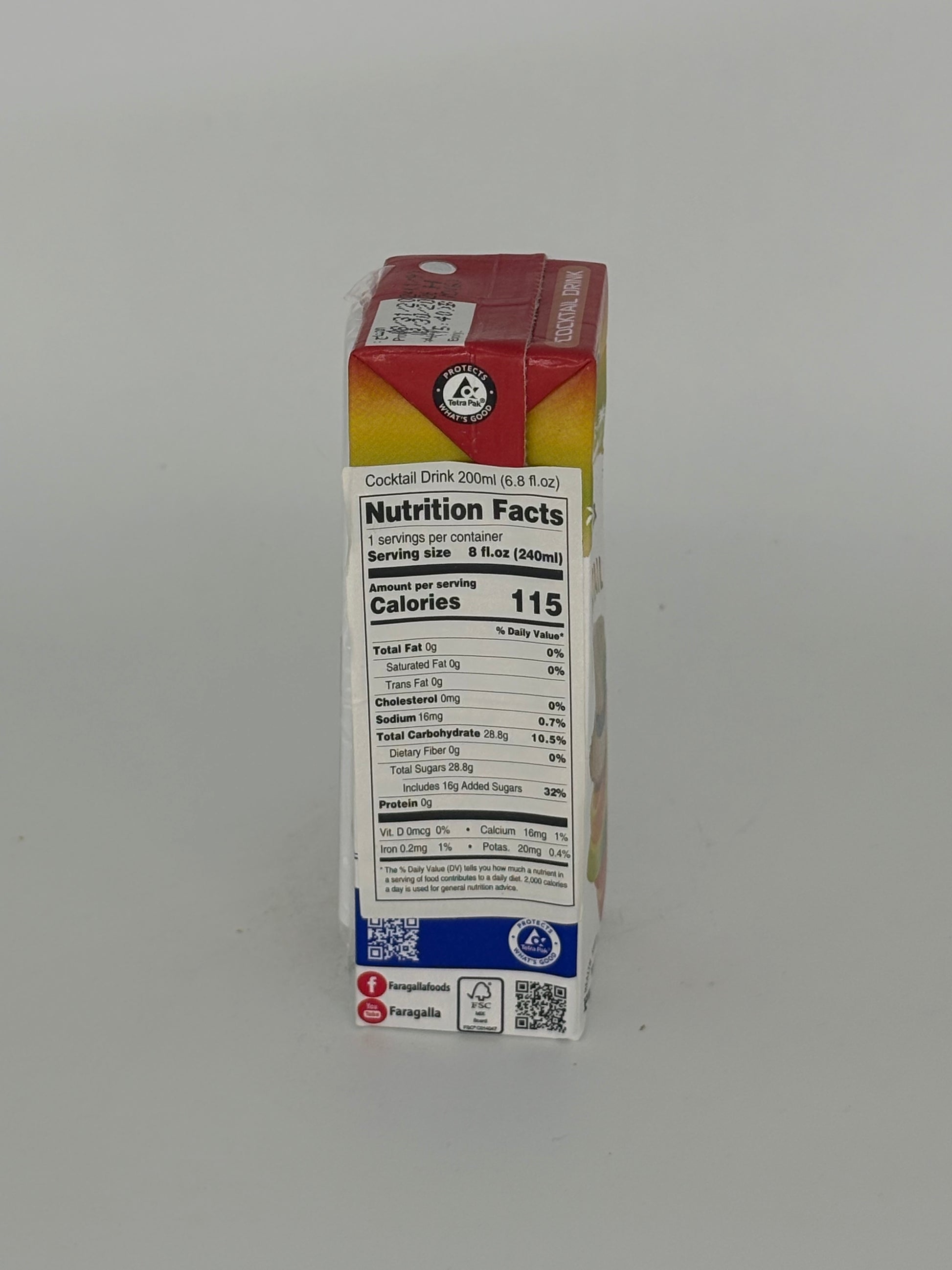 Easy Mouzuo Cocktail Drink in a small box delivers a blend of tropical fruit flavors. This refreshing beverage combines multiple fruits in a convenient single-serve format. Perfect for halal lunchboxes and on-the-go refreshment. A fruit cocktail juice box.