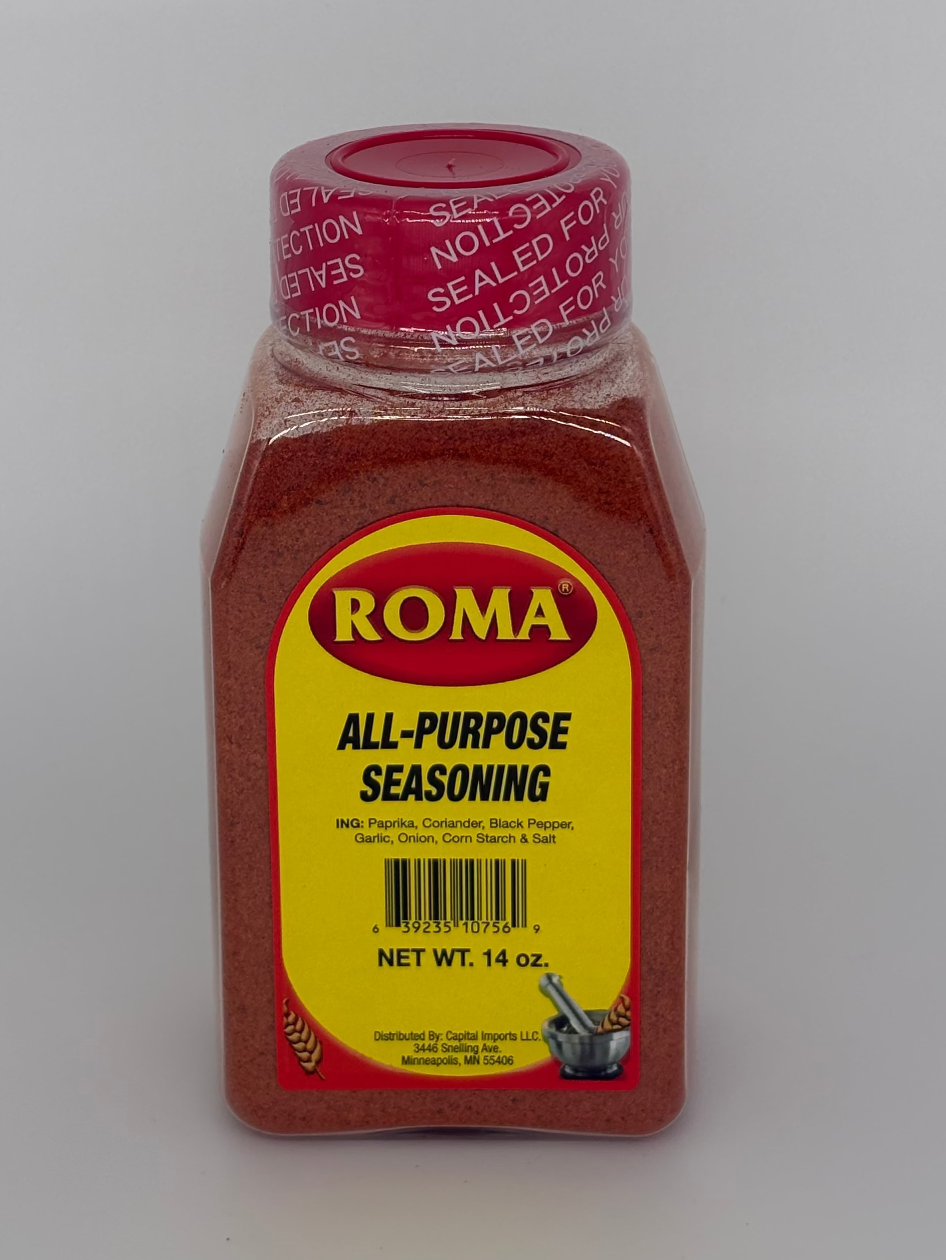 Roma All-Purpose Seasoning is your go-to blend for everyday cooking. This versatile 14oz container features a balanced mix of herbs and spices that enhances meats, vegetables, rice, soups, and more. Perfect for busy cooks who want to add consistent, delicious flavor to any dish. A kitchen staple for halal cooking that simplifies meal preparation.